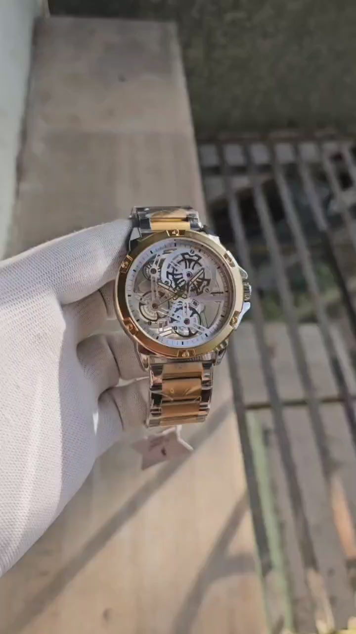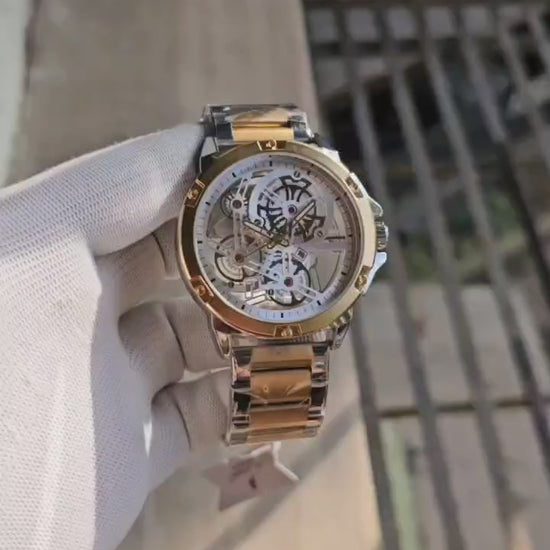 Experience the best with PLATINUM. This 7A high quality, original model is perfect for men. Featuring a round case shape, transparent skeleton design dial, quartz movement, and a date function. The metal strap and analog display add to its heavy quality. Trust in the best, for the best, with PLATINUM.